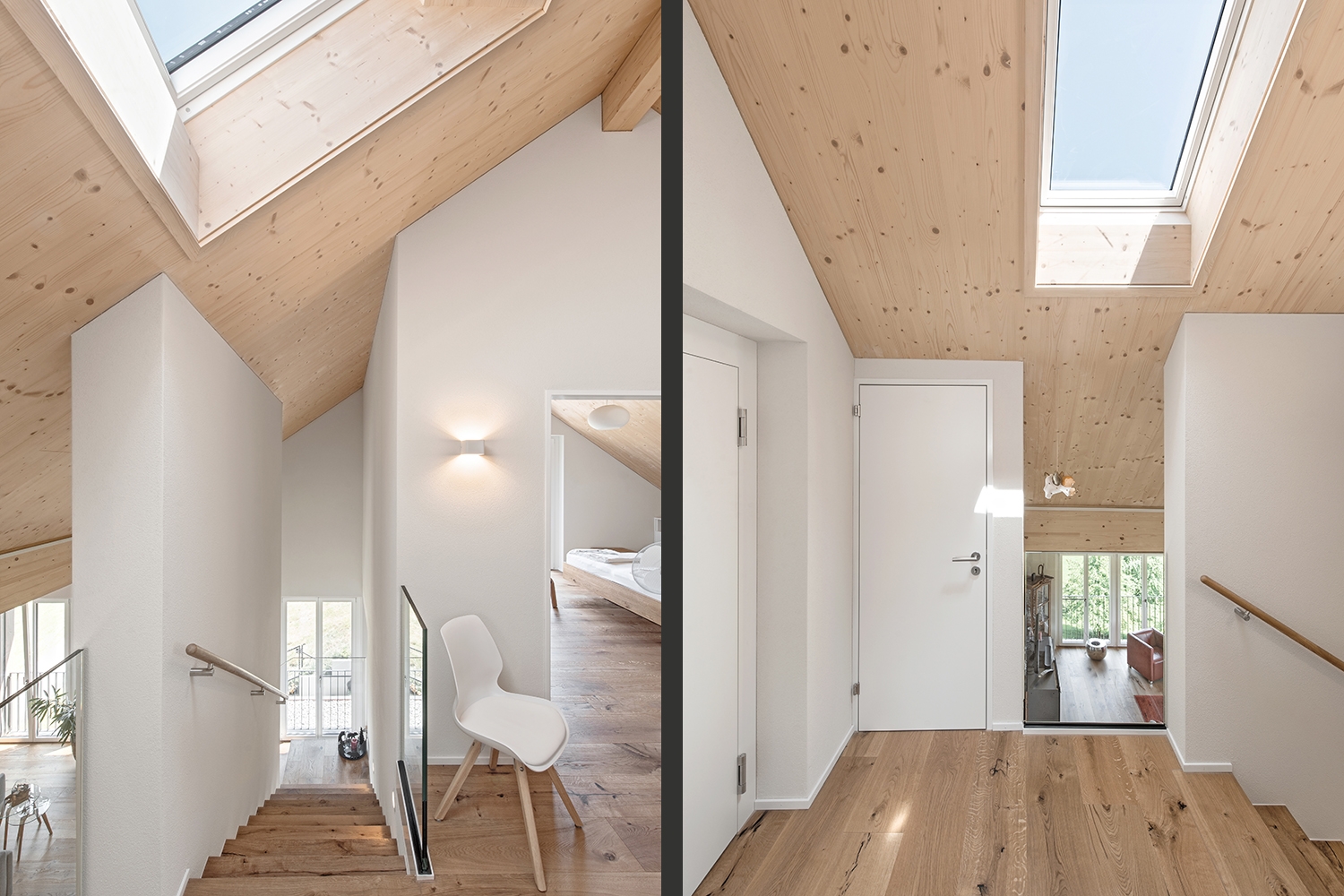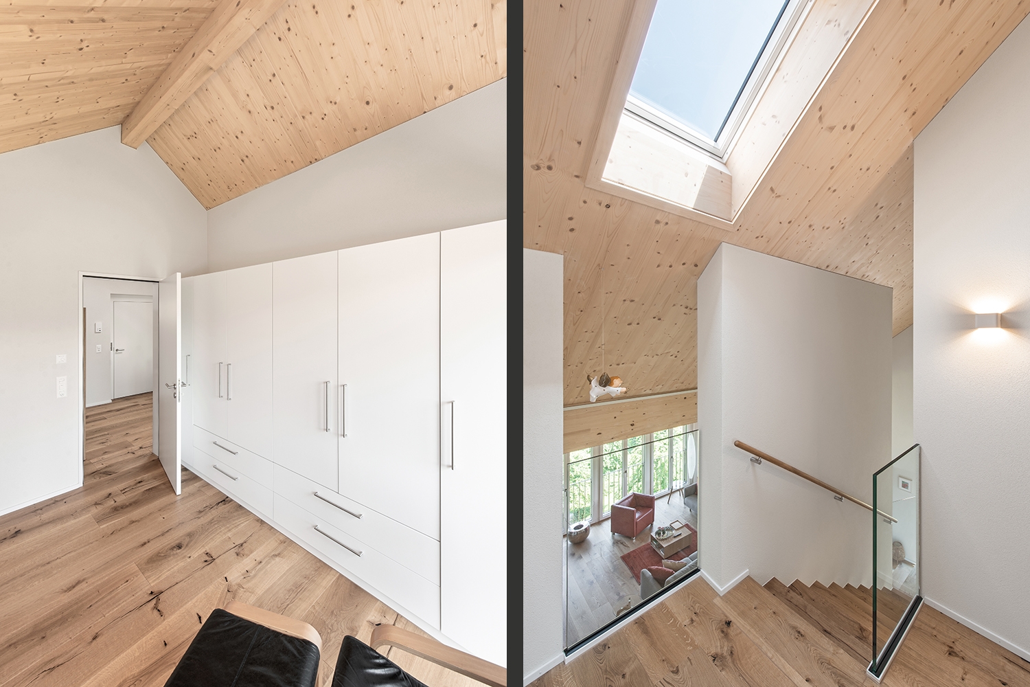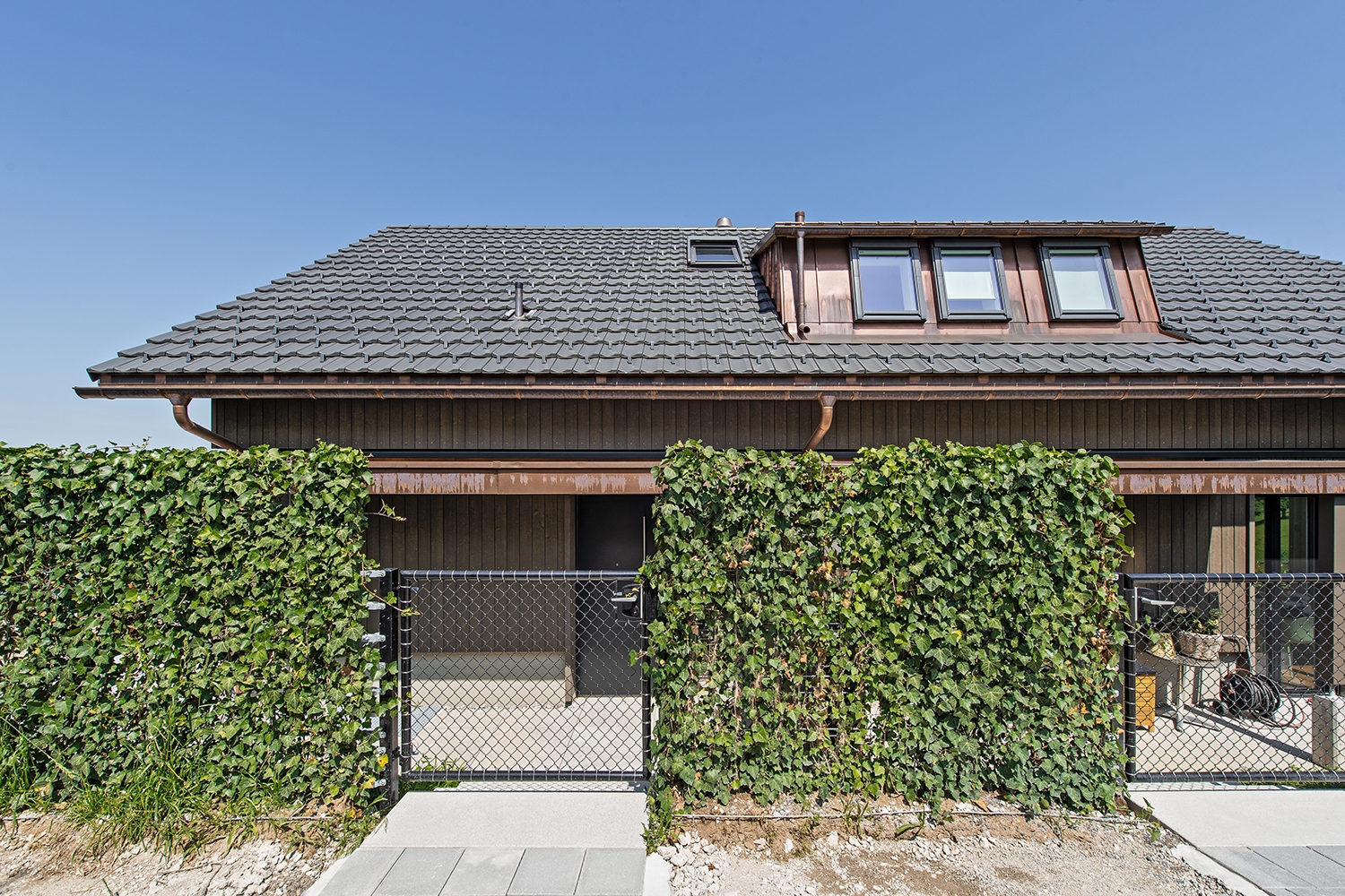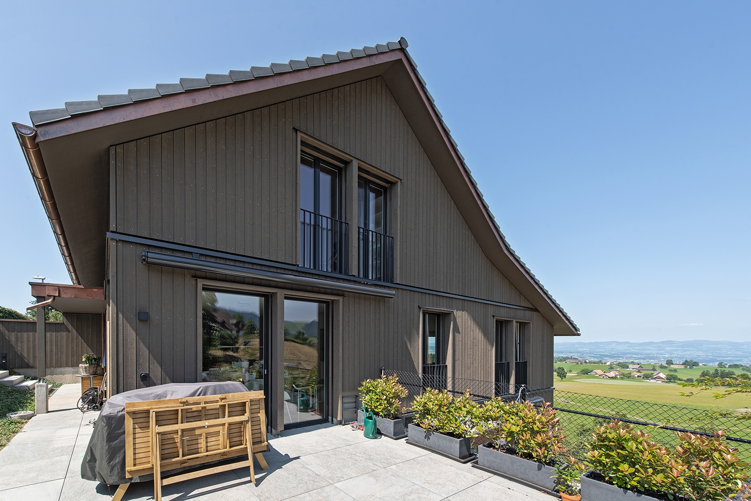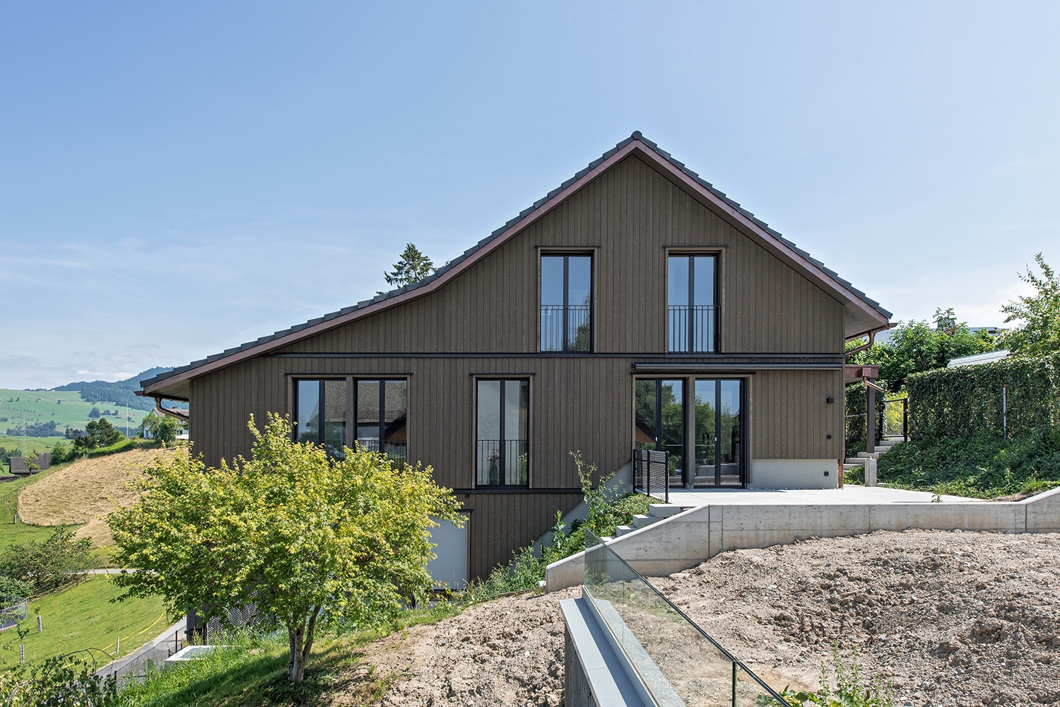 Dachstuhl in Elementbauweise, mit Dachfenstern und Lukarnen. Fassade in Dämmaufbau mit Holzschalung. Fenster, Innen- und Aussentüren. Energienachweis.